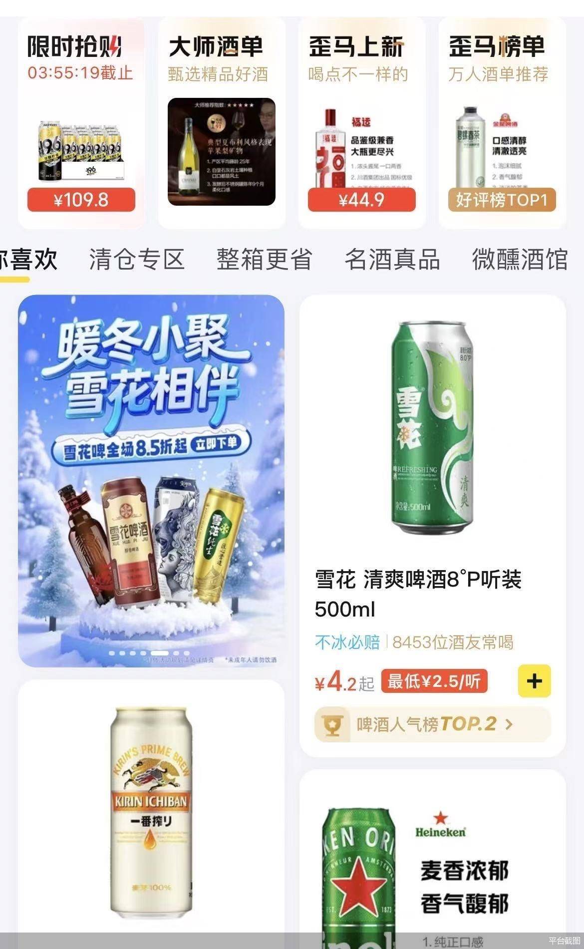 北京商报记者登录歪马送酒小程序发现,首页展示了啤酒、黄酒、白酒、葡萄酒等品类人气榜、回购榜、热销榜等细分榜单。其中,啤酒人气榜中,位列前三的产品分别为燕京U8啤酒8°P瓶装500ml、雪花清爽啤酒8°P听装500ml以及歪马精酿德式小麦啤酒12°P听装1L,三款产品单款成交价均低于16元;洋酒人气榜中,位列前三的产品分别为伏特加原味40度700ml、百加得白朗姆酒40度750ml以及马利宝白朗姆椰子风味配制酒50ml,售价均低于100元。而作为价格相对较高的白酒产品而言,其人气榜上前两款产品均为售价50元/瓶以下的红盖、黄盖玻汾。