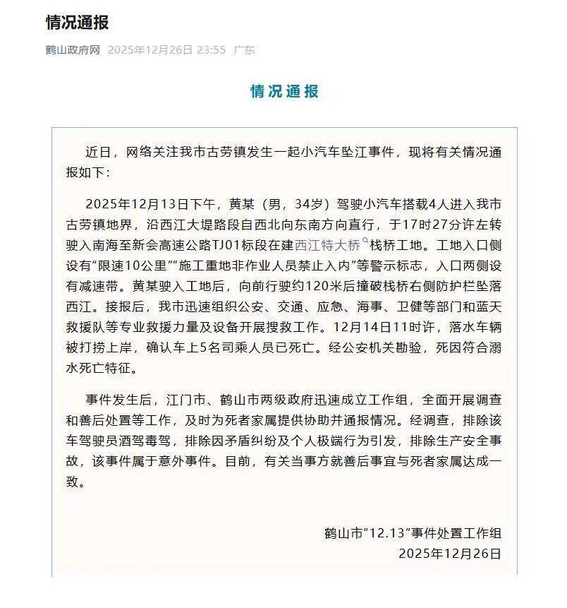 12月26日深夜,“鹤山市政府网”发布由鹤山市“12·13”事件处置工作组出具的情况通报称,12月13日下午,鹤山市发生一起小汽车坠江事件,导致5名司乘人员死亡,经调查,排除酒驾毒驾,排除因矛盾纠纷及个人极端行为引发,排除生产安全事故,该事件属于意外事件。目前,有关当事方就善后事宜与死者家属达成一致。