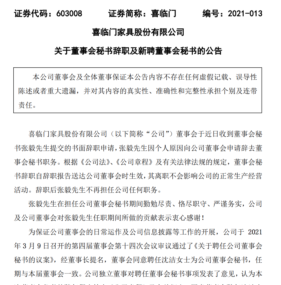 值得一提的是,在公布2020年年度财报前,喜临门的董秘张毅还从该公司离职,宣告任职了4年董秘生涯结束。作为替代,喜临门聘任了其董事会办公室副主任、证券事务代表沈洁作为董事会秘书,接管张毅的工作。