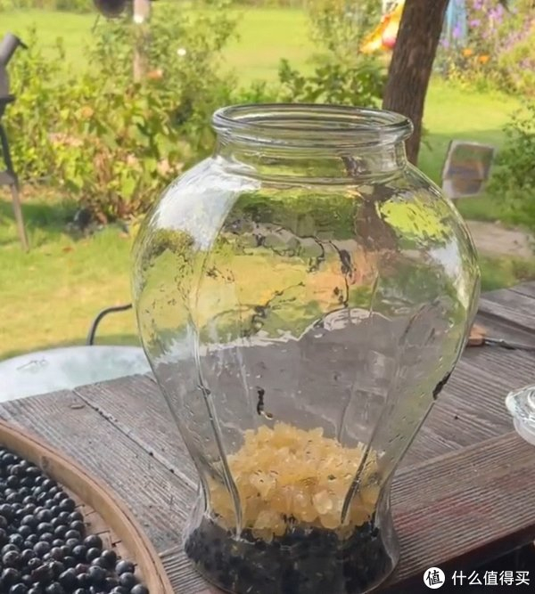 2. 葡萄装瓶:在玻璃容器底部先铺一层冰糖,然后带上一次性手套将葡萄捏破放进容器内,尽量做到果肉不分离,这样可以减少后面过滤的困难。装好后再最上面铺一层冰糖,不能装的太满,因为葡萄发酵会有气体。