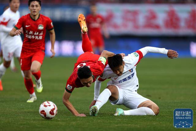 ↑ 河南足球俱乐部酒祖杜康队球员王上源(前左)与云南玉昆队球员张宸梁(前右)在比赛中拼抢。
