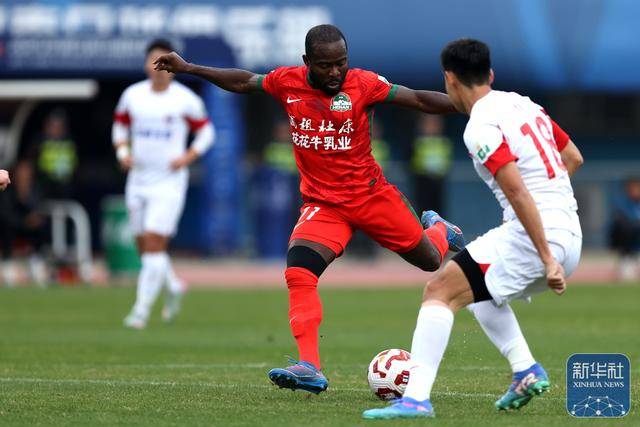 ↑ 河南足球俱乐部酒祖杜康队球员阿奇姆彭(前左)在比赛中射门。