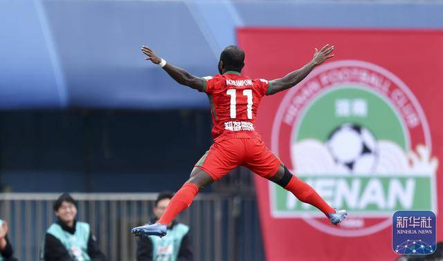 ↑ 河南足球俱乐部酒祖杜康队球员阿奇姆彭在比赛中庆祝进球。