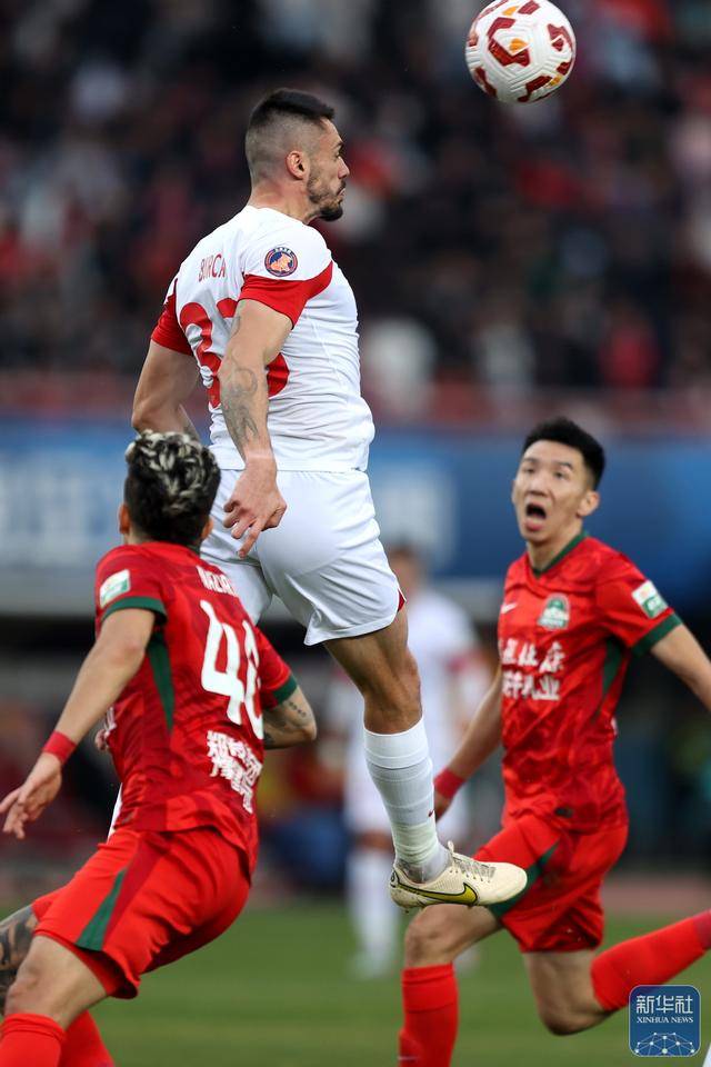 ↑ 云南玉昆队球员布尔克(上)和河南足球俱乐部酒祖杜康队球员纳萨里奥(左)在比赛中。