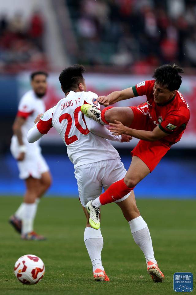 ↑ 河南足球俱乐部酒祖杜康队球员王上源(左)在比赛中。