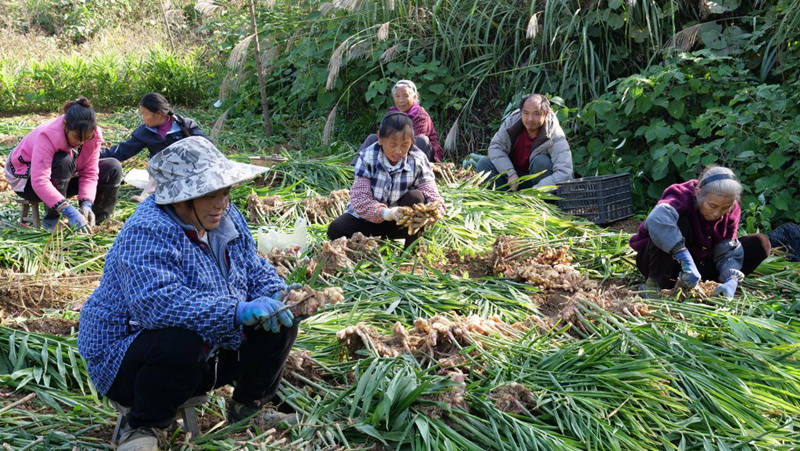 立冬过后,贵州省铜仁市江口县官和乡200余亩生姜迎来了采收期,村民们抢抓当前天气晴好的有利时机,加紧采收生姜供应市场。
