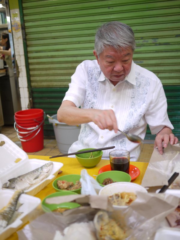 蔡澜是这里的熟客,现任老板的父亲当家时,他就经常光顾了,“因为茶和炒米粉很好吃”。其他如叉烧、烧肉、野生黄鱼、马友鱼、咸鱼、印尼大春卷、印尼饭和印尼面,则是从周围不同店家买来的。“菜市场买来的最新鲜。”蔡澜边招呼大家多吃一点,边介绍每一道菜或主食的特点。在附近住了十几年,他每天早上五六点就起床,去菜场买菜,然后吃早饭。问他早饭是不是天天这么丰盛,他说是,早饭很重要,而且之后还要正常吃中饭,不过晚饭就吃得很少。