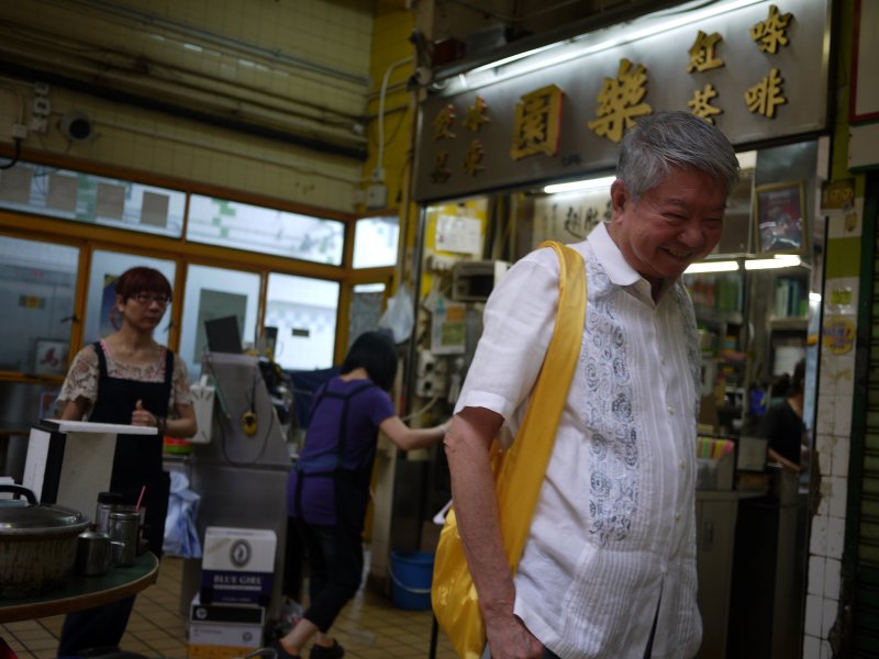 于是第二天一早8点半,就睡眼惺忪地来到约定的乐园茶餐厅。蔡澜已经在和老板说笑了,桌上则摆满了从不同地方打包的点心和菜肴。这家茶餐厅在九龙城衙前围道九龙城市政大厦的2楼,更像是室内大排档的一个摊点。1988年以前,它是真正的露天小摊,就像这边近年来进行的菜市场改造一样,香港的很多路边摊也经历过一轮搬进大楼的洗礼。