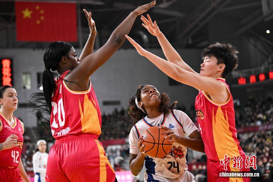 1月14日,山西队球员布朗(红衣)在比赛中争抢篮球。当日,在太原举行的2025-2026赛季中国女子篮球联赛(WCBA)常规赛第16轮比赛中,山西竹叶青酒队主场以91比78战胜上海浦发银行队。中新社记者 韦亮 摄