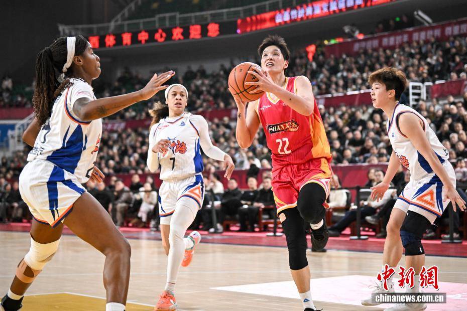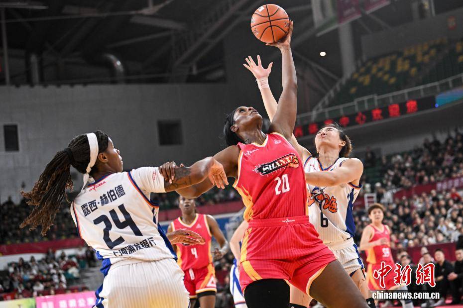 1月14日,山西队球员埃格博(红衣)在比赛中投篮。当日,在太原举行的2025-2026赛季中国女子篮球联赛(WCBA)常规赛第16轮比赛中,山西竹叶青酒队主场以91比78战胜上海浦发银行队。中新社记者 韦亮 摄