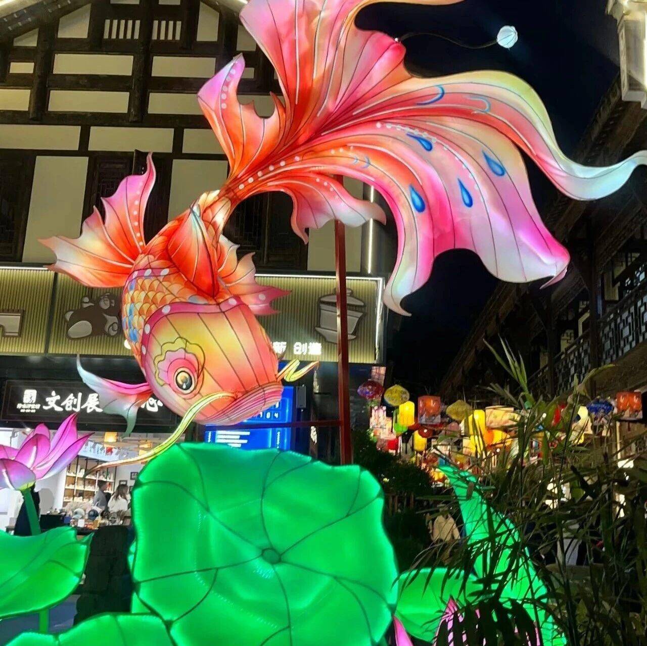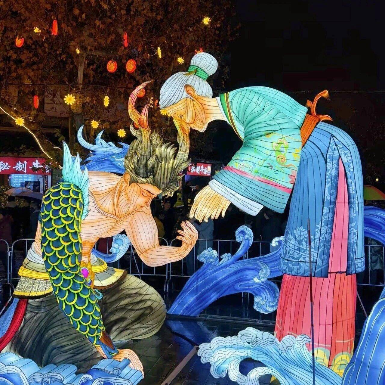 ☘️转个弯,“青城山下白素贞”灯组自带仙气,随手一拍都是古风大片。?“李冰治水”灯组复现了两千多年前先民治水的壮阔场景,脚下的石板路都仿佛沾上了岷江的水汽。