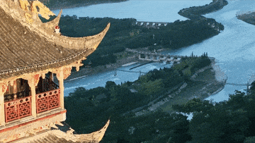 ▲鸟瞰都江堰水利工程鱼嘴分水堤。(动图来源:新华社)