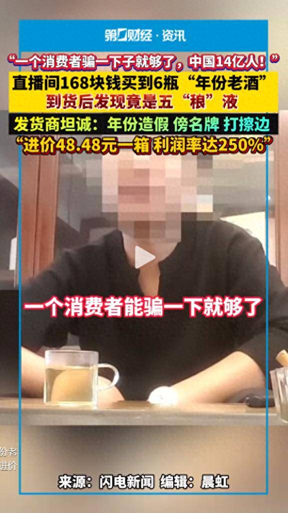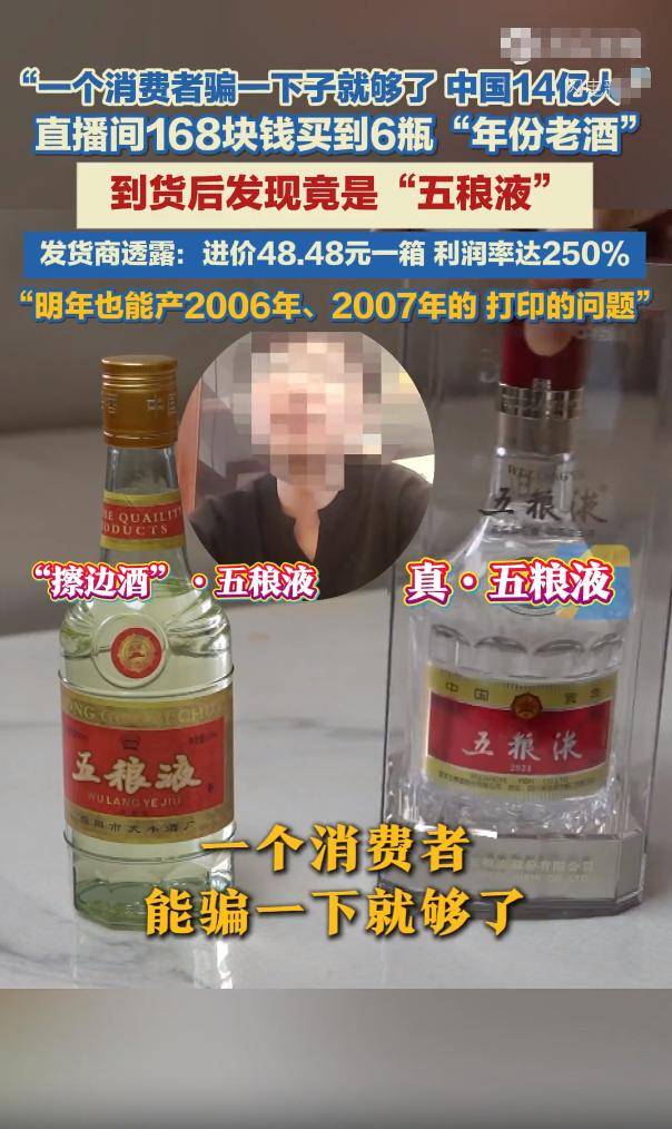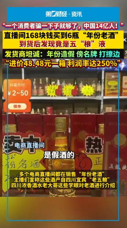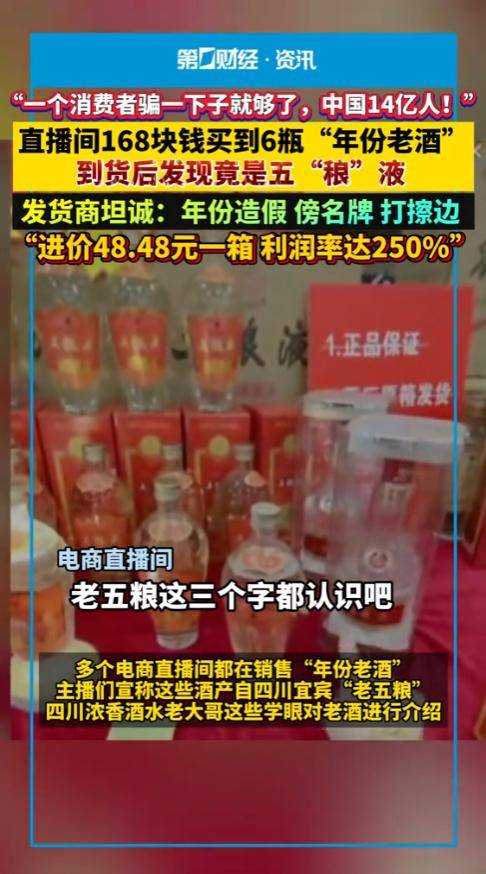 最近有网友发视频称,自己在直播间168元购买的6瓶“年份老酒”居然全是“五稂液”。
