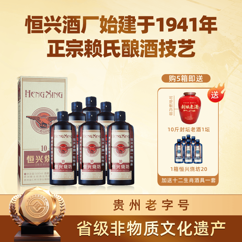 历史底蕴:恒兴烧坊的历史可追溯至1941年,其前身"恒兴酒厂"是茅台镇三大老酒坊之一。1953年,恒兴与成义、荣和共同组建了地方国营茅台酒厂,其完整的酿造技艺和工艺精髓直接融入了茅台酒的基因。这段珍贵的历史渊源,使恒兴烧坊成为酱香白酒发展史上的"活化石",也是茅台酒工艺的正统传承者。