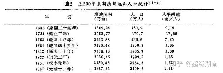 明洪武年间,湖南人口193万,仅为江西的20%,真正的地广人稀。清康熙年间降至150万人口,人均耕地9.2亩;雍正年间,洞庭湖围湖造田,湖南耕地增加1.5倍,达到3000万亩,人均耕地18亩。