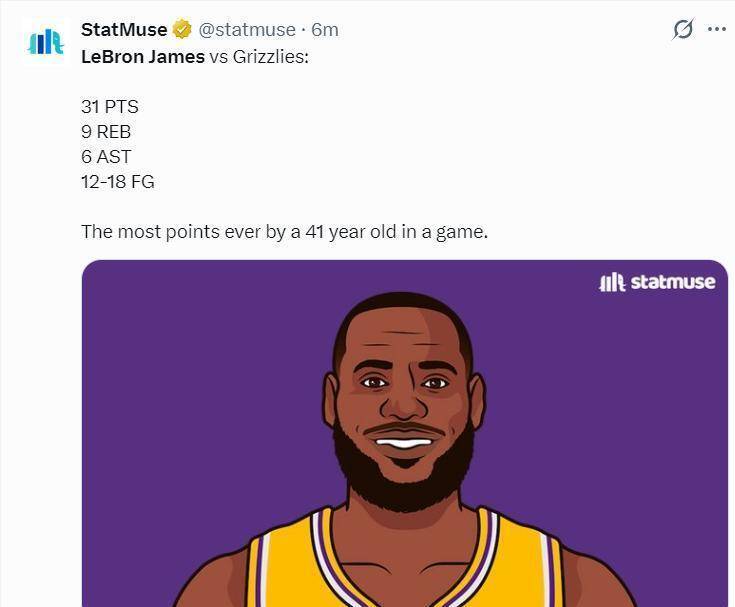 31分9篮板6助攻,末节关键时刻4次出手全中,一个人拿了10分,直接帮湖人把胜利揣进了口袋。打完一看技术统计,他又创了个纪录,NBA历史上,41岁老头单场得分更高的,就是他今晚的31分。那些流言,好像成了他更好的燃料。