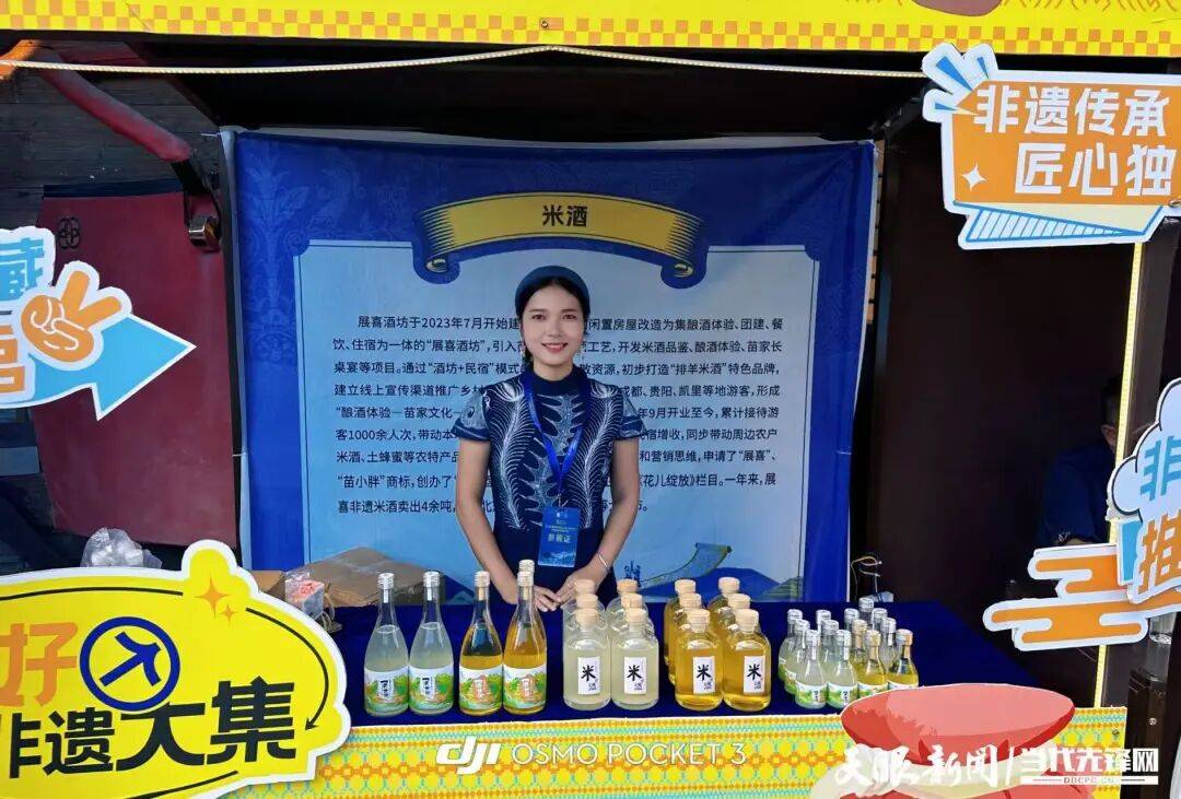 在第三届中国非物质文化遗产保护年会暨第四届丹寨非遗周上,一位身着蜡染民族服饰的姑娘格外引人注目。清脆的笑声与浓郁的酒香交织,她穿梭于展台之间,热情地向来往人群介绍面前的酸汤米酒。