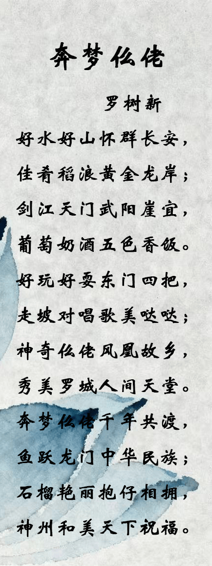 第二节“好玩好耍东门四把,走坡对唱歌美哒哒”,明显带有民歌节奏与口语韵味,充满欢快气息。“走坡对唱”是极具民族辨识度的民俗活动,老师用“歌美哒哒”这样极富地方色彩的表达,把歌声的甜美、情绪的热烈直接传达给读者,毫不造作,反而真诚动人。接着“神奇仫佬凤凰故乡,秀美罗城人间天堂”,由具体活动上升到整体家园的赞美,把仫佬文化的神奇与现实生活的美好自然融合,情感饱满而不显夸张。