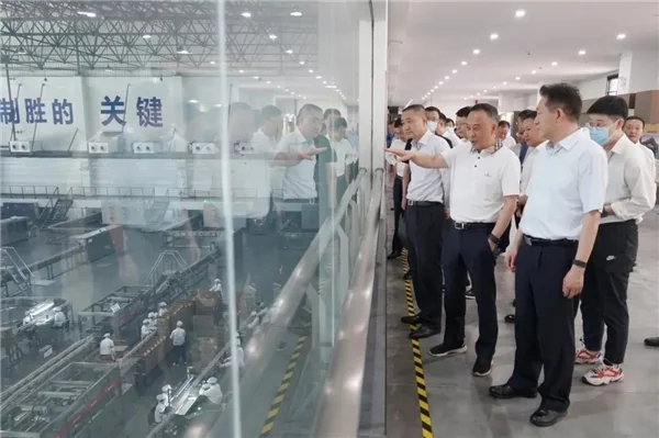 ▲汪俊林向杨林兴一行介绍郎酒包装车间生产情况