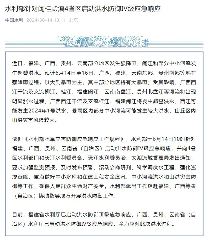 水利部针对闽桂黔滇4省区启动洪水防御Ⅳ级应急响应