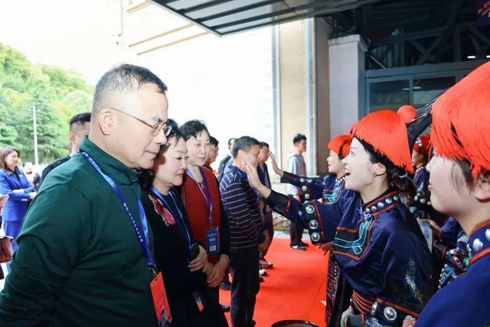 踏入雄正文化基地,企业家们先被仡佬族迎客点朱砂仪式深深吸引,这一古老仪式承载着仡佬族人民的热情与祝福,仪式中,嘹亮的歌声悠扬回荡,鲜红的朱砂轻点在宾客额头,寓意吉祥如意,大家纷纷举起手机记录下这独特时刻。紧接着,仡佬族“三幺台”、“三净礼”等传统民俗的仪式感也让他们赞叹连连,纷纷化身“打卡达人”拍照分享,将这份独特体验传播出去,让更多人了解雄牌背后仡佬族千年的深厚文化。