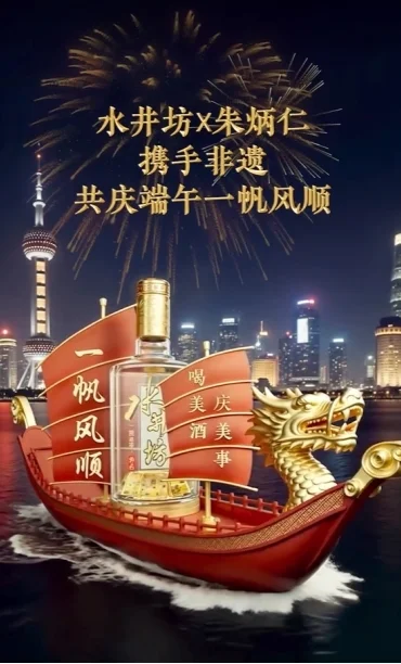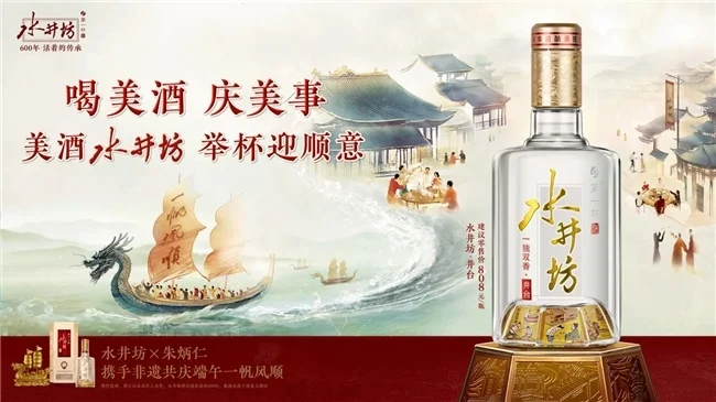 水井坊在端午来临之际,携手非遗大师朱炳仁共同设计“一帆风顺金龙舟”, 将“顺意”的美好内涵注入水井坊美酒之中,在华夏大地共同祈愿安康顺遂的美 好时节,让象征着一帆风顺的龙舟满载“高品质、高颜值、深内涵”的美酒,“驶” 入千家万户,为每一个欢聚共庆的美好时刻,带来的节日体验与端午祝愿。