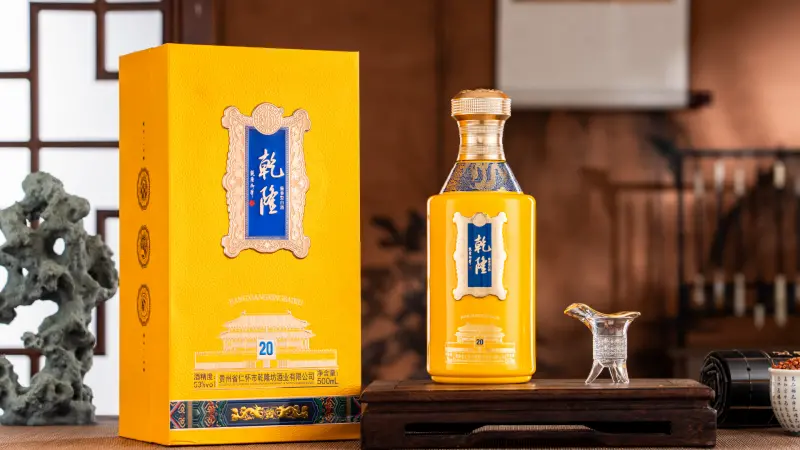 乾隆・20作为高端代表,瓶身设计灵感源自故宫匾额,正中“乾隆”二字笔力遒劲,瓶颈龙纹环绕,帝王黄主色调尽显皇家风范;酒体则精选高粱、小麦为原料,秉承传统工艺,酱香突出、陈香浓郁,定位高端宴请与典藏,让消费者在品味中感受盛世气韵。
