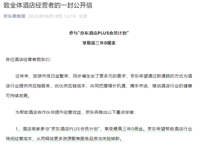 近日,刘强东又双叒叕登上热搜。6月18日,“京东黑板报”微信公众号发布《致全体酒店经营者的一封公开信》,宣布酒店商家参与“京东酒店PLUS会员计划”,可享更高三年0佣金。