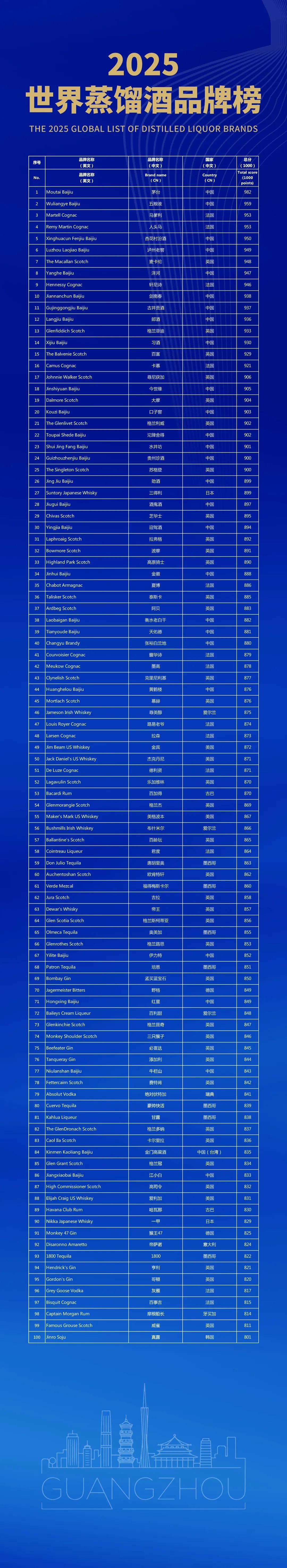 2025年10月31日,由国际品牌科学院、国际蒸馏酒品牌中心主办、世界酒类进出口协会、中国(广州)国际名酒展览会组委会协办、泸州市人民政府作为支持单位的2025世界蒸馏酒品牌榜发布会在广州保利洲际酒店成功举办。