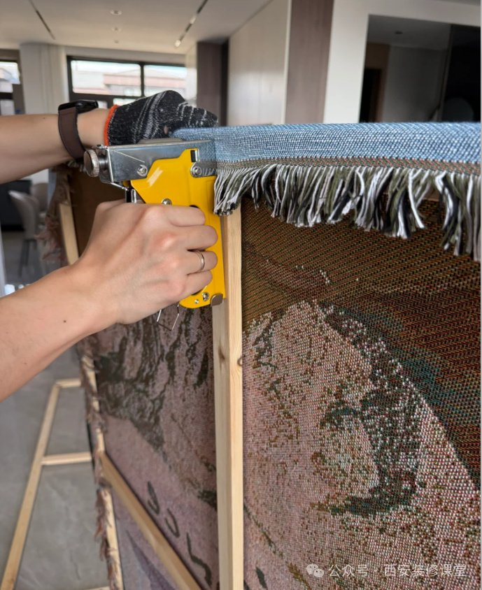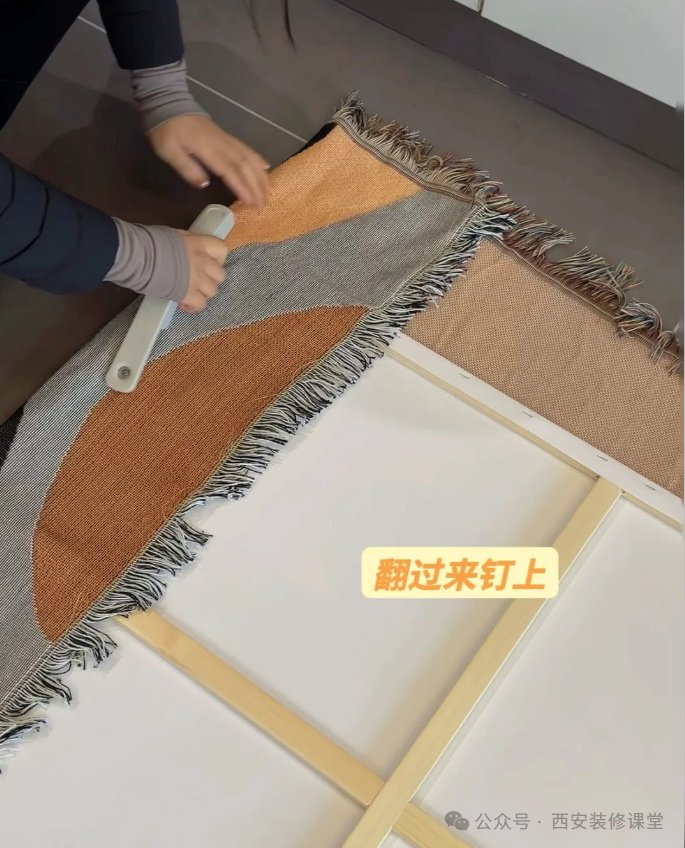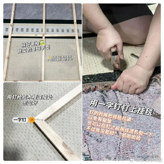 材料清单:1.搜索线毯选择大小款式;2.搜索实木画框,挑选大小即可;3.搜索手动钉枪很多。