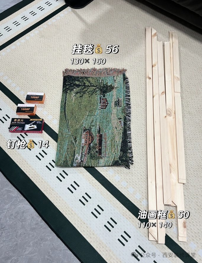 网友@臣枫:客厅大白墙缺一副超大尺寸挂画,挑了好几个月,如果买成品画,基本都要花小1k。动手购买松木画框+挂毯,自己DIY花费100元搞定1000元装饰画。