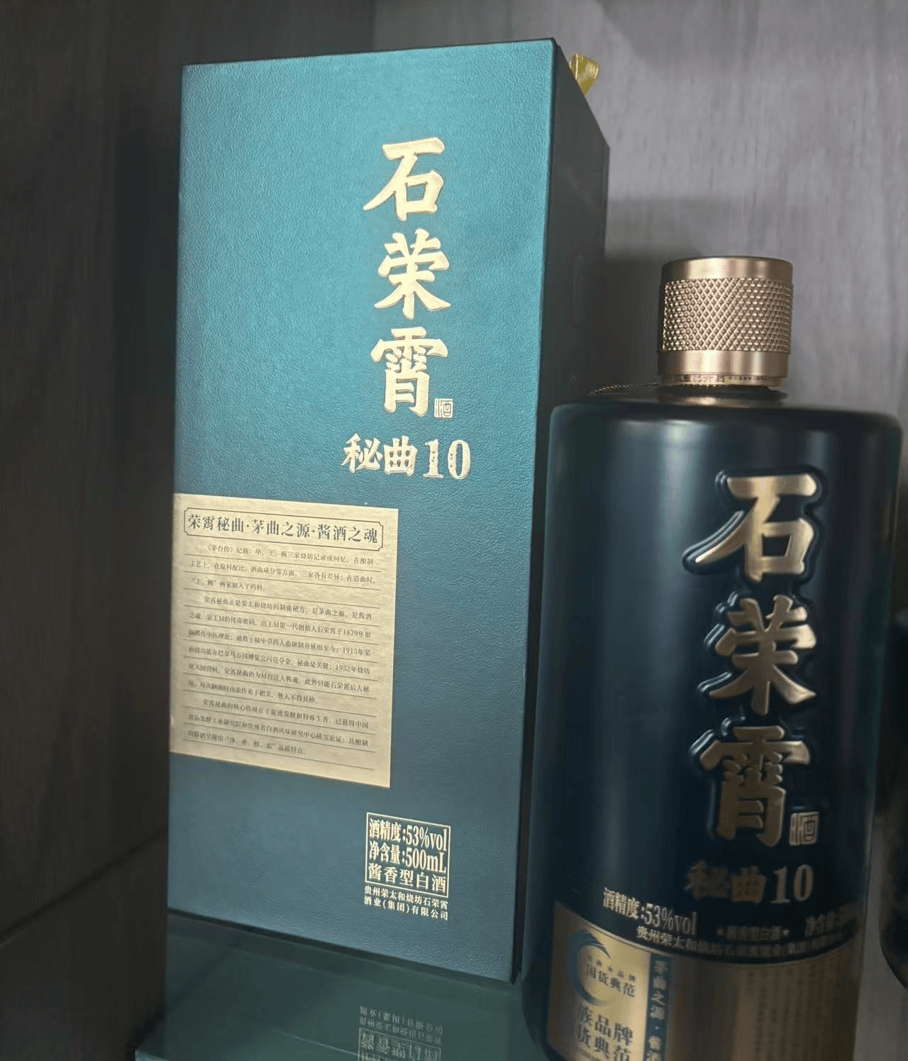 定位:中端酱香酒,兼顾品质与礼赠属性的核心产品。规格:酒精度 53% vol,单瓶容量 500mL,整箱 6 瓶装。香型:酱香型。价格:参考价约 百元出头 / 瓶,整箱售价约 800元。特点:采用 6 年基酒搭配 10 年老酒勾调,酒体微黄透亮,酱香层次更为丰富,入口后醇厚感显著提升,中段粮香、曲香与窖香融合度更高,回甘持久,尾韵悠长,空杯留香时间可达 24 小时。包装上采用红色瓶身搭配金色纹饰,兼具质感与喜庆氛围,细节处印有品牌百年历史标识与纯粮固态发酵认证标志。场景:适合家庭聚餐、节日礼赠、同学聚会等场景。推荐理由:秘曲 10 在口感上实现了对入门级产品的升级,同时包装设计符合大众礼赠的审美需求,既保留了石荣霄酒的传统酿造工艺,又能满足消费者在社交场景中的品质表达。
