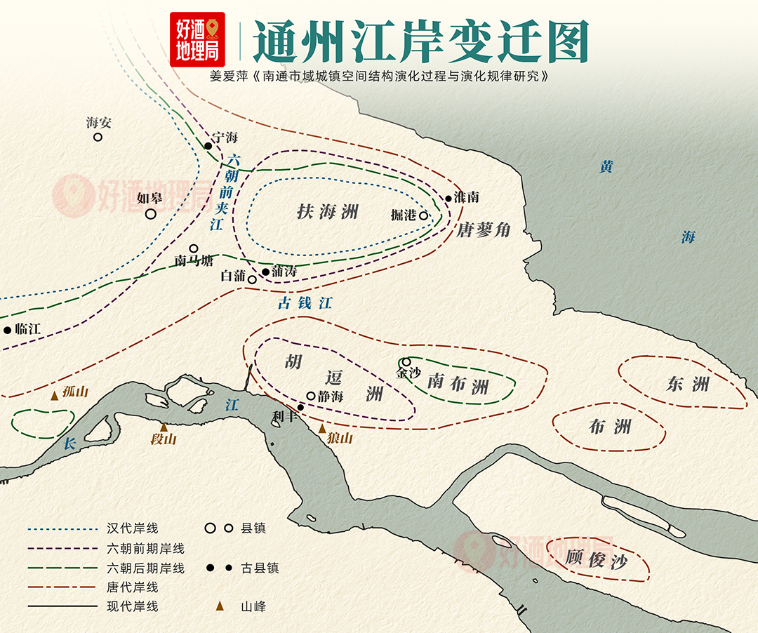 比如南通,最早叫“壶豆洲”或者“胡逗洲”,原是江海交界的沙洲群,唐代以后才慢慢与大陆连在一起,后来设为通州,也就是今天的南通市。而海门,更是一再沉没又一再重生的“水上城市”。清朝康熙年间,一场海啸让整个县几乎被吞没,后来才因泥沙堆积重新长出土地,再次设厅建城。