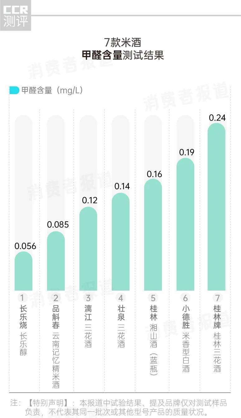 测试结果显示,7款米酒均检出了甲醛,含量在0.056mg/L~0.24mg/L之间。其中,长乐烧长乐醇为0.056mg/L,桂林牌桂林三花酒为0.24mg/L。
