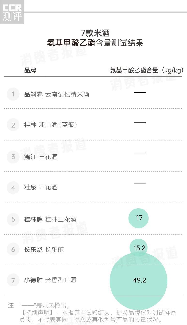 测试结果显示,长乐烧长乐醇、小德胜米香型白酒、桂林牌桂林三花酒等3款米酒检出了氨基甲酸乙酯,含量分别为15.2μg/kg、49.2μg/kg和17μg/kg。