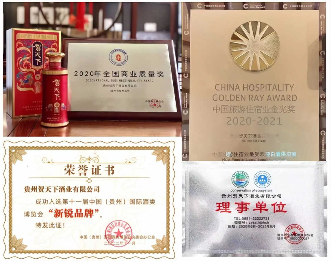 凭借对高品质的执着追求和良好的市场口碑,贺天下酒业在竞争激烈的市场中屡获殊荣,品牌知名度和美誉度持续攀升,先后于2020年获得全国商业质量奖的殊荣、2022年荣膺第十一届中国(贵州)国际酒类博览会“新锐品牌”奖、“2022年度更具品潜力中国品牌”,其取得的行业荣誉和市场口碑有目共睹。