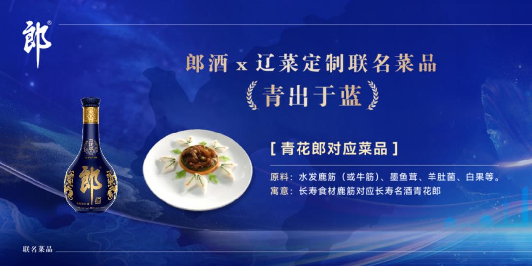 其中,“青出于蓝”选用红烧鹿筋作为主料,搭配东北地区特有的菌类及其他配料共同红烧,将青花郎酒融入菜品制作和搭配理念中,借其“7+20”年的时光沉淀和鹿筋共同凸显口感;