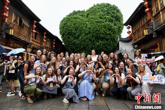 7月12日,美国青年在福州三坊七巷古街区爱心树前合影留念。当日,前来参加2025年“鼓岭缘”中美青少年合唱周的美国青少年参访福建福州三坊七巷古街区,体验中国传统文化。中新社记者 王东明 摄