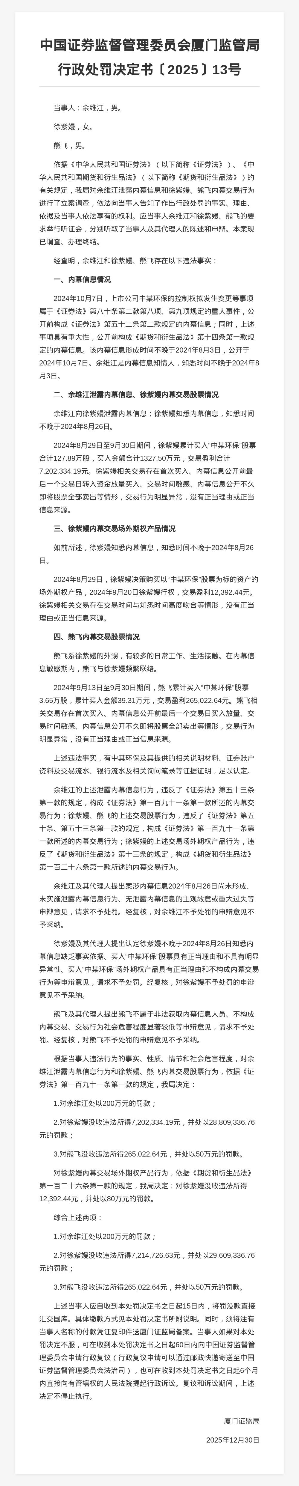 对此,厦门证监局决定对余维江处以200万元的罚款;对徐紫嫚没收违法所得7,214,726.63元,并处以29,609,336.76元的罚款;对熊飞没收违法所得265,022.64元,并处以50万元的罚款。