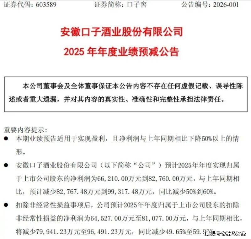 1月7日,兼香型白酒龙头企业口子窖披露2025年度业绩预告。数据显示,2025年全年,口子窖预计实现归母净利润6.62亿元至8.28亿元,同比大幅下滑50%至60%,创下近年来更大业绩跌幅。