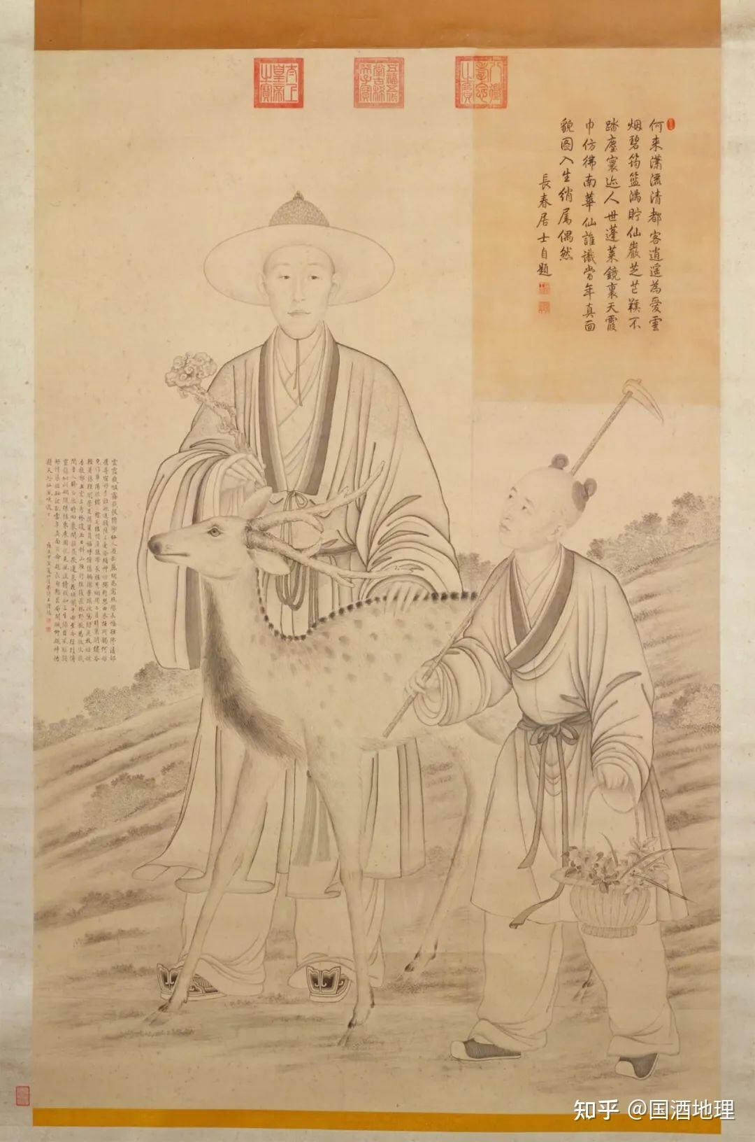 自古灵芝和鹿都是延年的吉祥象征。图画中持芝抚鹿的乾隆也因此一手鹿血酒,一手灵芝酒,达到了美滋滋的保健效果。