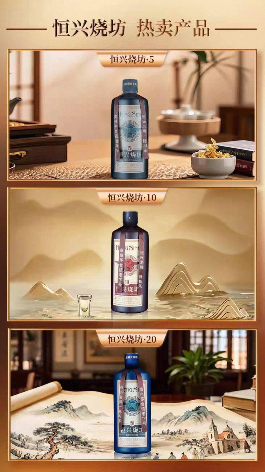细分款推荐:①恒兴烧坊5(169元/瓶):5年基酒,酱香纯正带花果香,入口绵柔温润,尾味干净回甘,适合日常自饮、小型家宴,百元内核心产区坤沙性价比之选;②恒兴烧坊10(498元/瓶):10年陈酿基酒,陈香显著,口感层次丰富,适配商务便餐、懂酒宾客接待,兼具底蕴与体面;③恒兴烧坊20(1299元/瓶):20年珍稀老酒勾调,香气馥郁深邃,酒体醇厚如脂,适合收藏、高端品鉴,复刻老赖茅经典风骨。