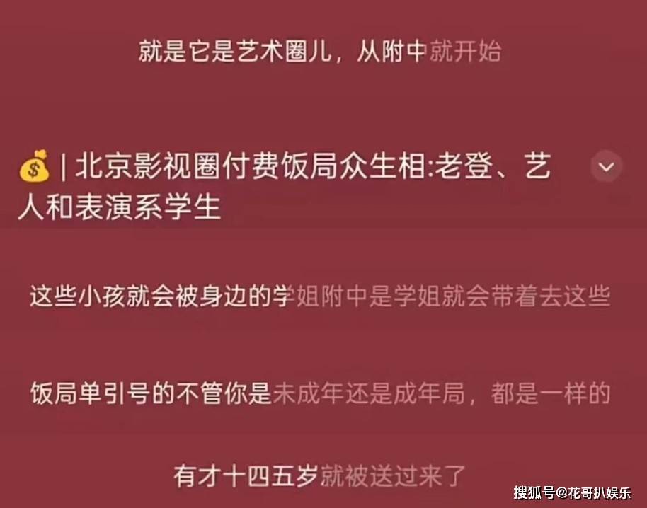 据爆料者透露,现在混北京艺术圈子的男孩、女孩小小年纪就被一群居心叵测的人盯上,早早地被拽进了光怪陆离的名利场,为所谓的出道梦铺路埋线,被有心人安排去参加一些付费饭局,有的甚至在读高中的时候已经开始接这种生意了,倒不是缺钱,只是觉得通过这个渠道可以认识大佬,后续当明星会走得更顺利一些。
