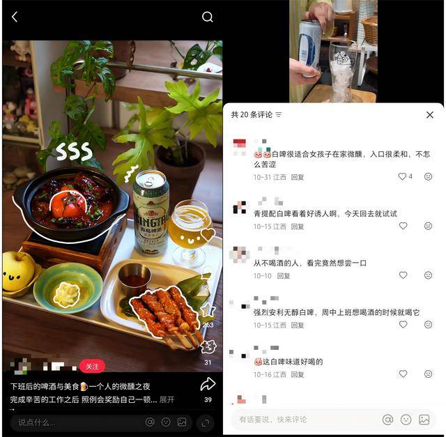在年轻人青岛啤酒白啤的种草笔记中,“一定要喝冷藏后的”“搭配一个漂亮的玻璃杯”成为品饮攻略,被赋予了一种“在日常中提升美感、幸福感”的意义,而不仅仅是品饮的酒精饮料。
