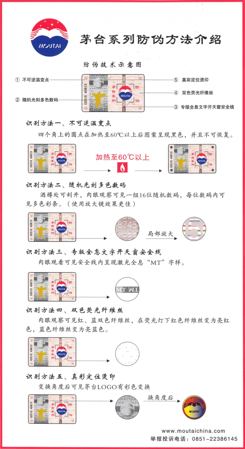 除了数字化防伪体系外,赖茅多数产品还和茅台共享防伪技术,例如茅台常见的“不可逆温变点”“随机光刻多色数码”“专版全息文字开天窗安全线”“双色荧光纤维丝”“真彩定位烫印”等技术以及“开瓶防伪设计”均和茅台一致,消费者可以通过多种方式一一验证产品真假。同时,复杂且难以仿制的防伪技术也持续为赖茅产品护航,保障产品的真实性与安全性。