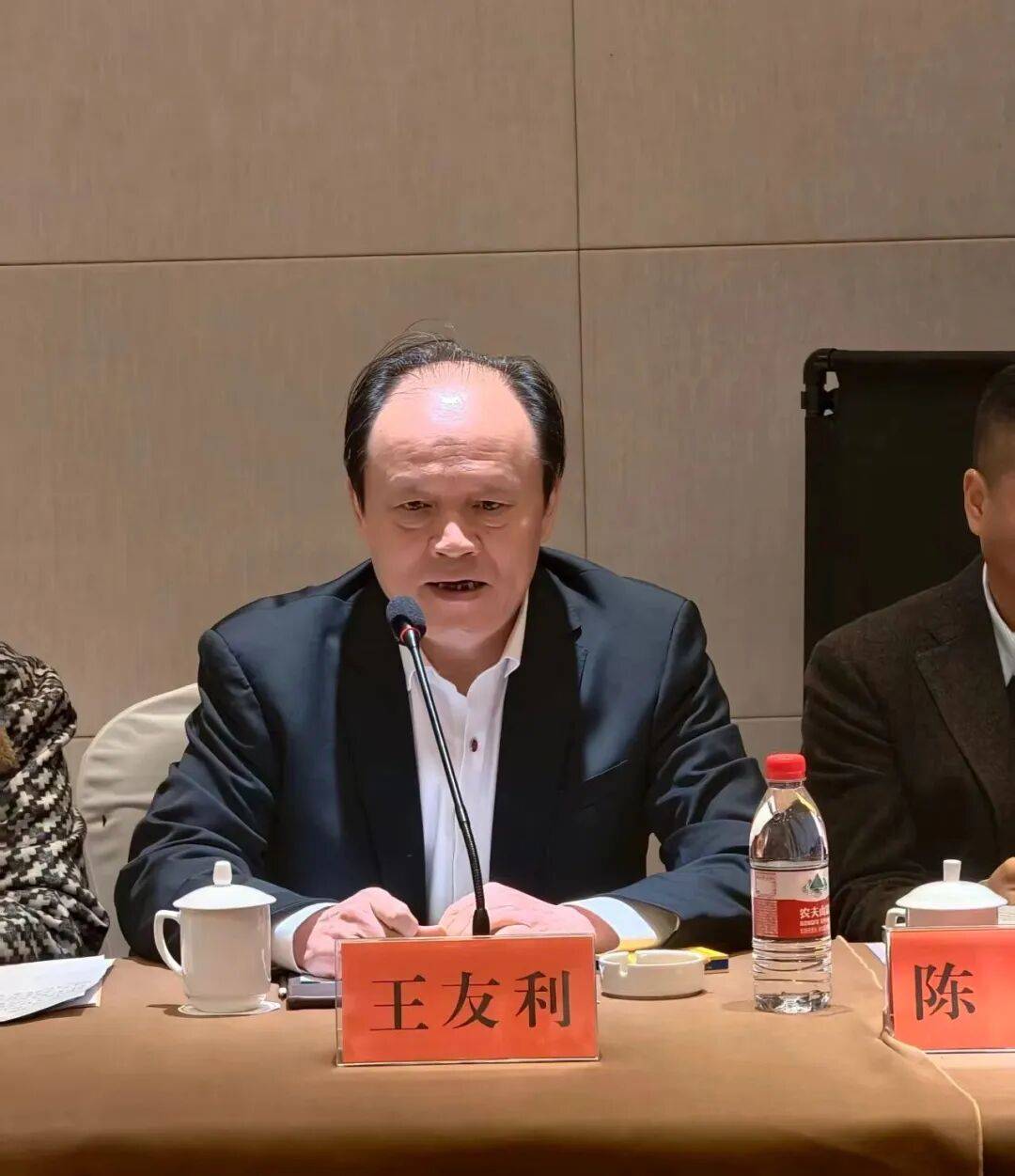 苏酒高质量发展联盟第六届轮值主席、江苏御珍酒业董事长王友利致辞。他介绍御珍酒业发展历史和自己的成长经历,介绍公司发展规划,并对省酒协和联盟的工作提出中肯的建议。