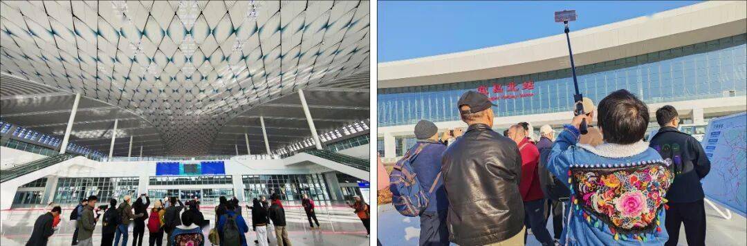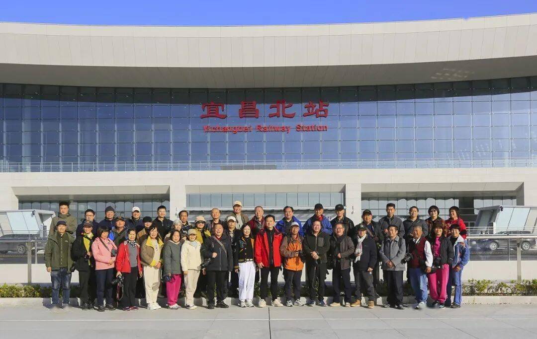 活动首抵宜昌北站。在工作人员的细致引导与专业讲解下,会员们有序探访站房外观、候车大厅、站台等核心区域。北站恢弘大气的建筑风格、智能化的设施配置,让大家不时驻足赞叹,纷纷举起相机、精准对焦,将这座“区域交通新枢纽”的挺拔风貌与细节之美一一定格。参观尾声,全体人员在北站广场并肩合影,为这场“见证发展”的采风之旅留下珍贵集体印记。