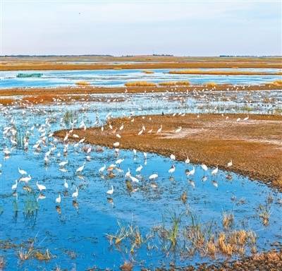 二龙涛河浅水湿地吸引了大量白鹤停歇觅食。 潘晟昱摄(人民视觉)