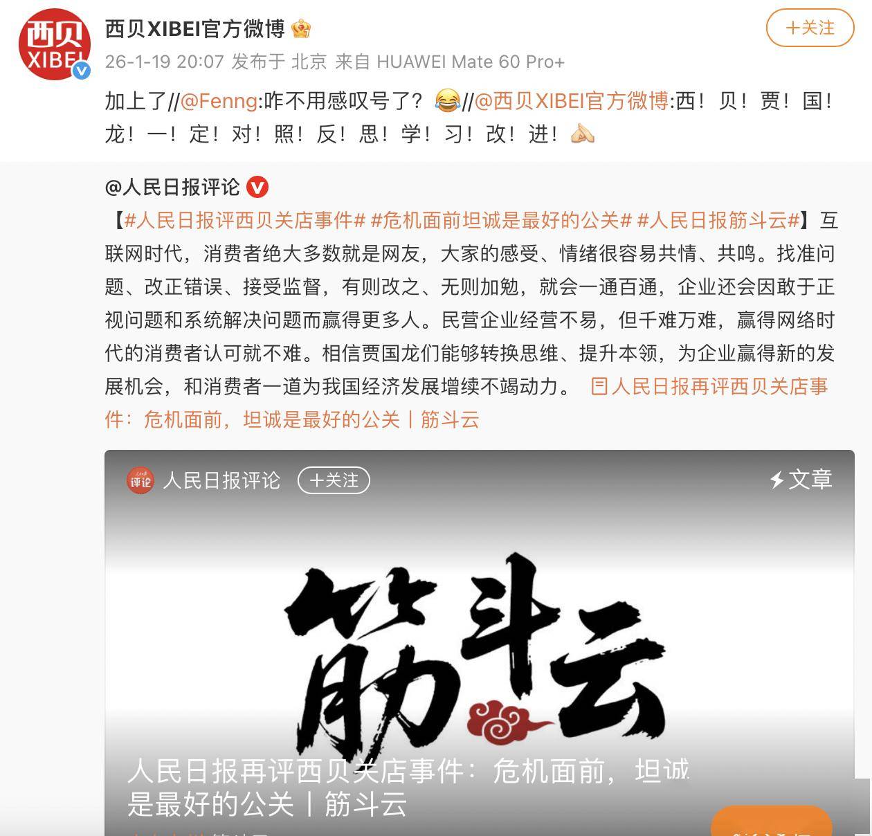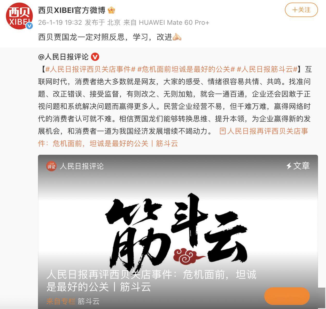 瑞财经 吴文婷1月19日,人民日报再评西贝关店事件,发布评论文章《危机面前,坦诚是更好的公关》。