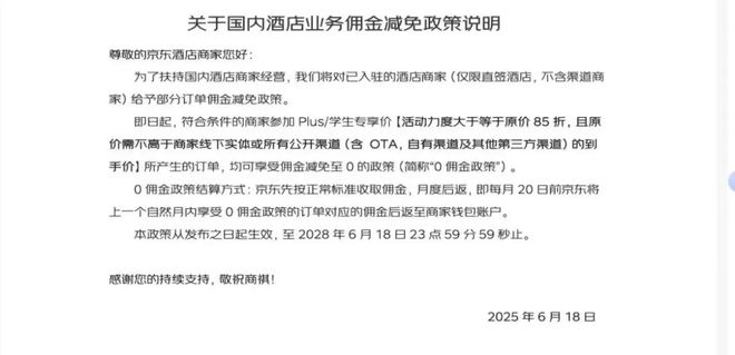 6月18日,京东官方微信公众号发布了一封致酒店经营者的公开信,正式宣布进入OTA行业。信中提到,酒店商家参与“京东酒店PLUS会员计划”,更高能享受到三年0佣金。